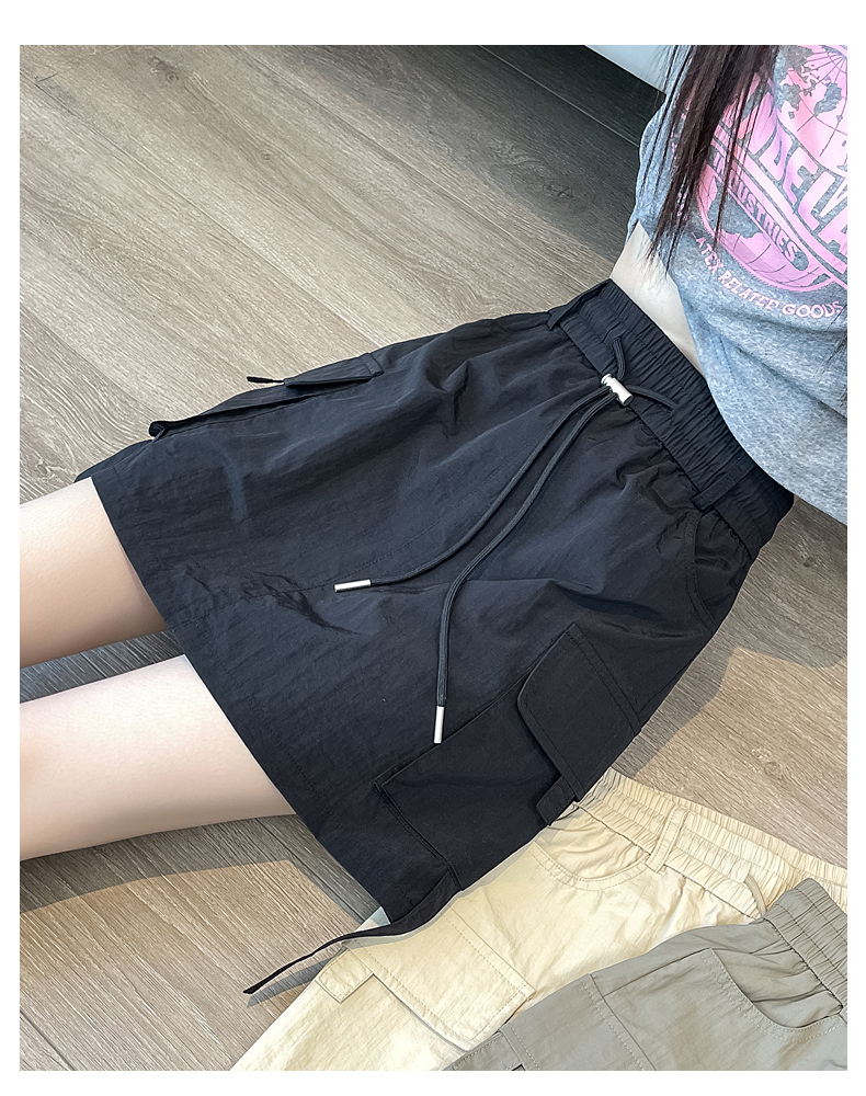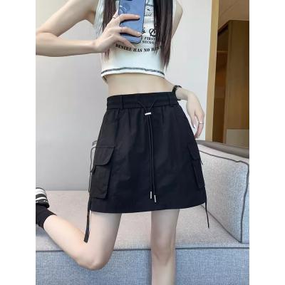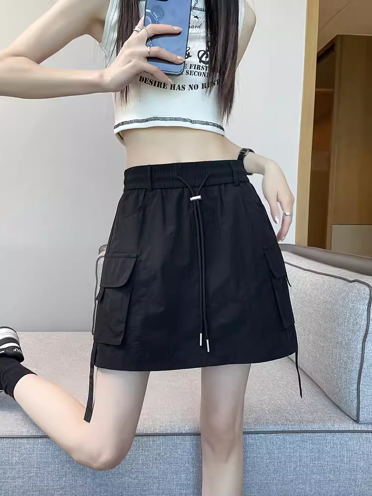 美式速幹工裝半身裙女高腰夏季薄款顯瘦寬鬆辣妹抽繩黑色休閒短裙